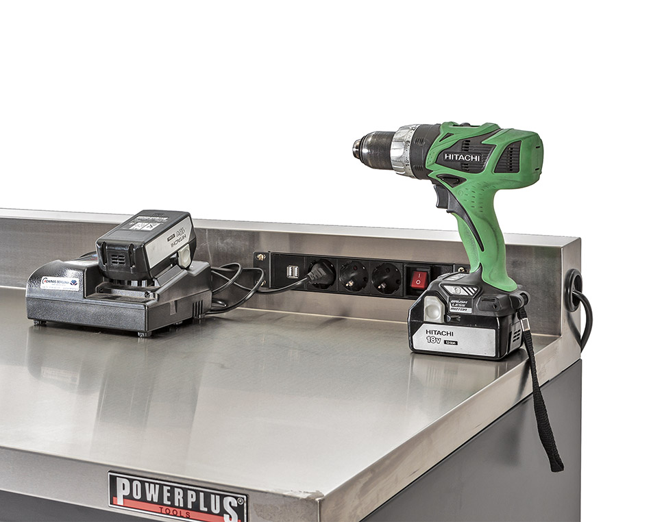 Werkbank mit Steckdosen und USB – Strom direkt am Arbeitsplatz