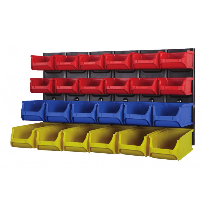 Praktisches Starter-Set mit 3 Gerätehalterschienen PP-T 0850 inklusive 15 Kunststoff Lagerboxen Abmessungen Kunststoff Lagerboxen: 16 x 10 x 7,5 cm. Gesamtgewicht inkl. Verpackung 3,4 kg. Abmessungen inkl. Verpackung: 62 x 22,5 x 10,5 cm.