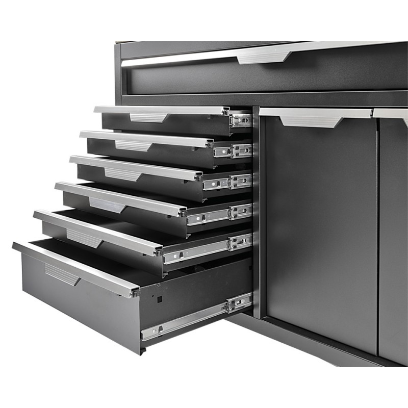 Optimieren Sie Ihre Werkstatt mit unserem eleganten Mattschwarzen Werkstatt-Set PBH5 mit Hartholzarbeitsplatte und den Gesamtmaßen von 136x61x200 cm.