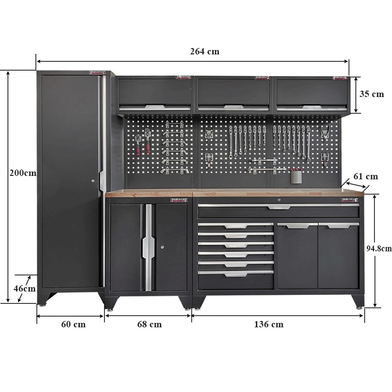 Werkstatt Set mit hohem Schrank in Mattschwarzen PBH11 mit Hartholzarbeitsplatte und den Gesamtmaßen von 264x61x200 cm.