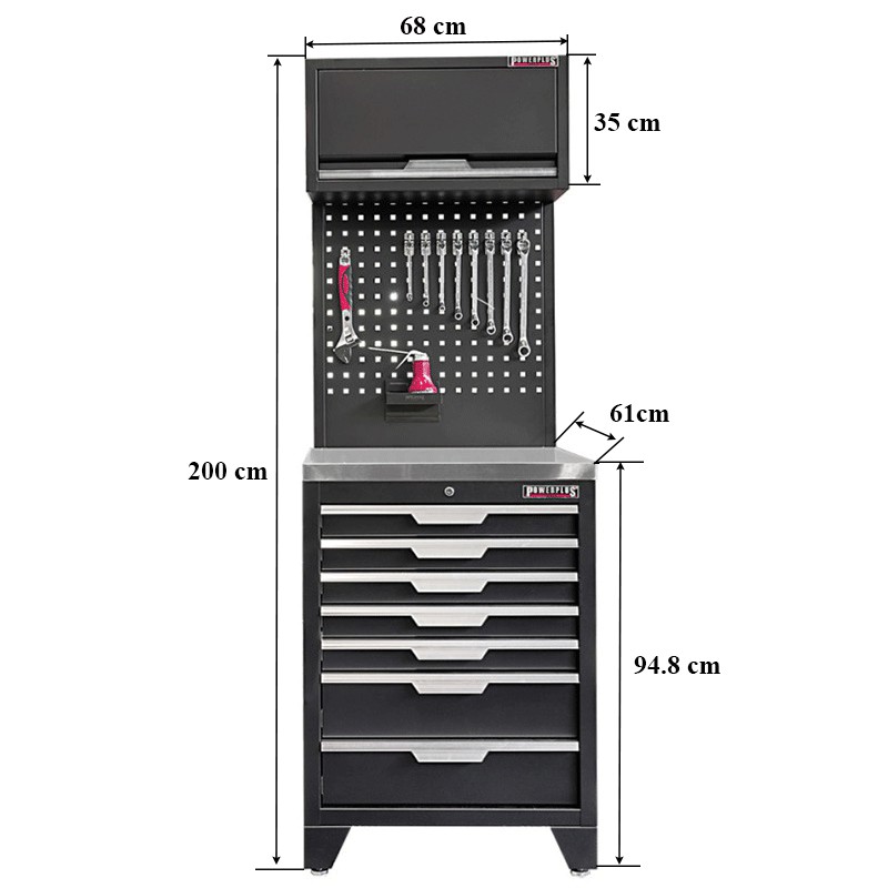 Optimieren Sie Ihre Werkstatt mit unserem umfassenden Mattschwarzen Werkstatt-Set PBR1 mit Metallarbeitsplatte in den Gesamtmaßen von 68x61x200 cm.