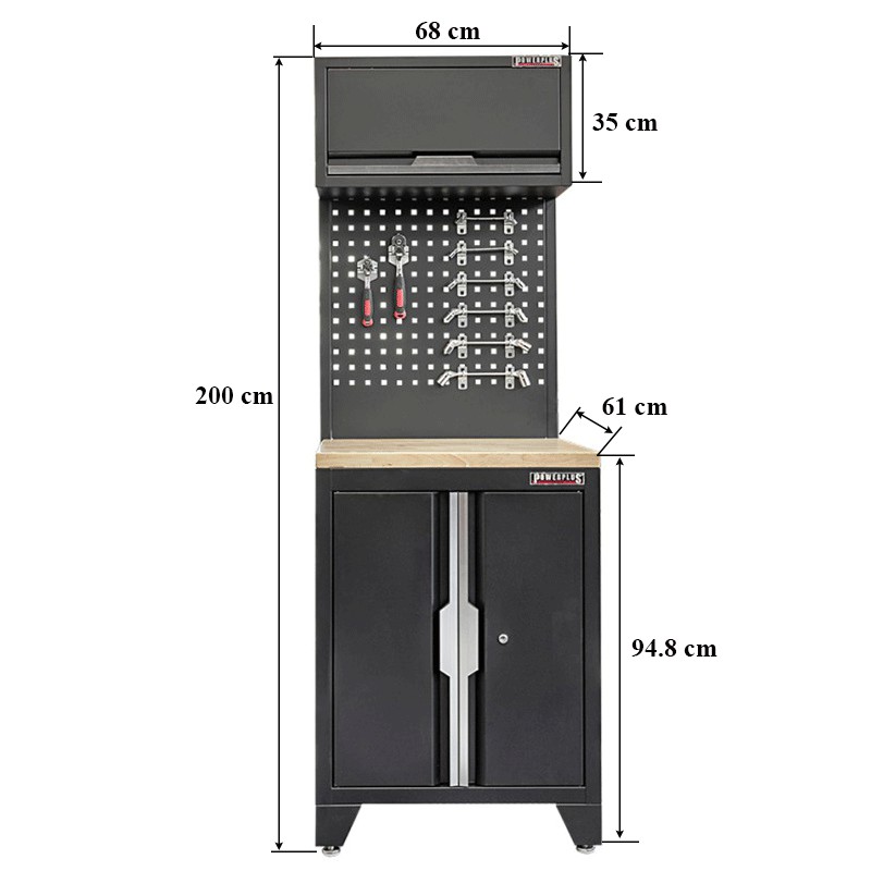 Optimieren Sie Ihre Werkstatt mit unserem praktischen Mattschwarzen Werkstatt-Set PBH3 mit 2 Türen und Hartholzplatte in den Gesamtmaßen von 68x61x200 cm.