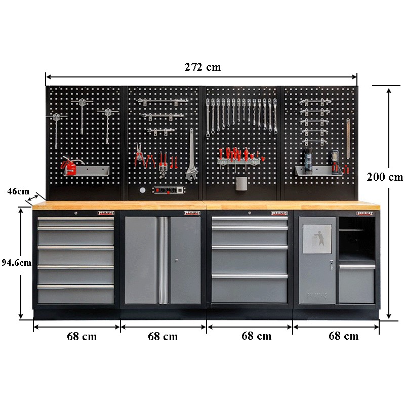 Stabiles Werkbank Set 272 cm mit Mattschwarzer Lochwand, Hartholzplatte bestehend aus: