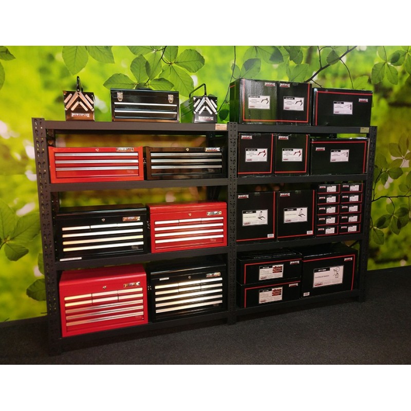 Lagerregal aus massivem Eisen mit 8 Stahlblechböden.