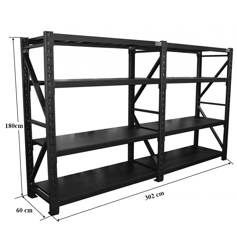 Lagerregal aus massivem Eisen mit 4 Stahlblechböden. Pfosten, Balken und Regale besitzen eine schwarze Hammerschlagpulver-Beschichtung. Abmessungen inkl. Pfosten: 155 x 60 x 180 cm. Abmessungen der montierten Fachböden: 139 x 60 cm. (1 Regal besteht aus 2 Teilen von 69,5 x 60 cm).