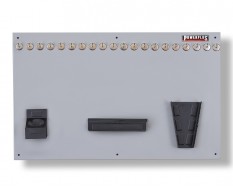 Werkzeughalterung Halterung für Lochwände PP-T 0970/0975 Zum Aufhängen von Werkzeug and den Lochwänden PP-T 0970 und 0975 Abmessungen: 37 cm. Länge (mit 6 kleineren und 6 größeren Aufhängungen) Dieser Werkzeughalter kann auf Lochwänden mit quadratischen Löchern von 12 x 12 mm verwendet werden. Mit einem Lochrastermaß von 45 mm. (Mitte Loch zu Mitte Loch)