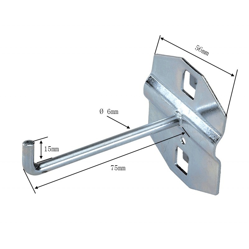 Dieser Haken kann auf Lochwänden mit quadratischen Löchern von 12 x 12 mm verwendet werden. Mit einem Lochrastermaß von 45 mm. (Mitte Loch zu Mitte Loch)