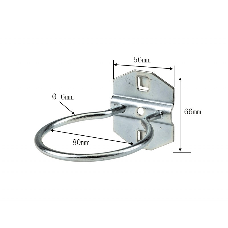 Werkzeughaken Ø 60 mm. (Innenmaß) zum Aufhängen von Bohrmaschinen an allen Powerplustools Lochwänden mit 12*12 Vierkantlöchern Materialstärke: Ø 6 mm. verzinktes Stahl Dieser Haken kann auf Lochwänden mit quadratischen Löchern von 12 x 12 mm verwendet werden. Mit einem Lochrastermaß von 45 mm. (Mitte Loch zu Mitte Loch)
