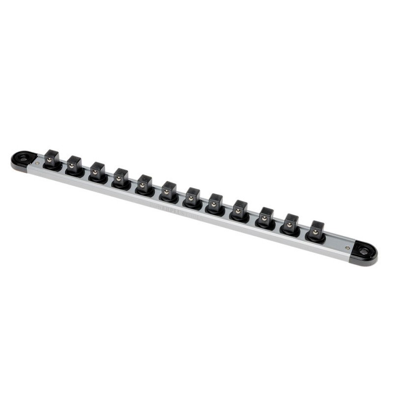 Diese Stecknussleiste für 1/2 Zoll Stecknüsse ist mit drehbaren Aufnahmen ausgestattet und verfügt über einen starken Magnetstreifen auf der Rückseite. Dadurch lässt sie sich flexibel an allen stahl- und metallhaltigen Oberflächen befestigen.