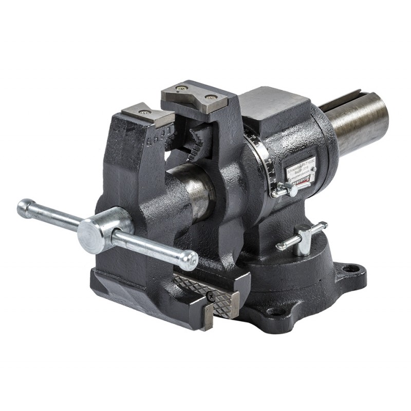 Der Schraubstock ist um 360 Grad drehbar, so dass die Rohraufnahme oder die Seite mit den gehärteten Backen zum Beispiel im 90 Grad Winkel verwendet werden kann.