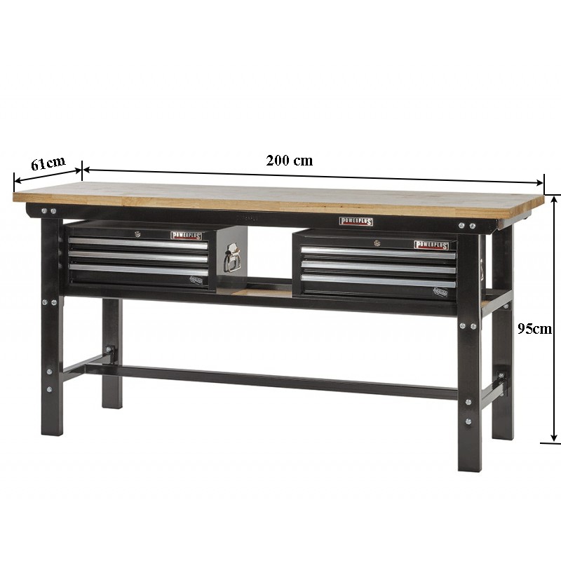 Stabile Werkbank mit lackierter Holzplatte und Lochwand die auch unter extremen Bedingungen standhält und zwei Werkzeugkisten Maße Werkbank: 200 x 61 x 95 cm. + Lochwand PP-T 0725HG - 200 x 61 cm. - Hammerschlag Grau Holzplatte aus massivem Holz (3,5 cm. dick) Mit praktischer Ablage aus Hartholz in Kniehöhe für Ihr Werkzeug