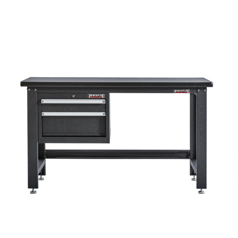 Stabile Werkbank mit Lochwand und Schubladeneinheit aus beschichtetem Stahlrahmen und darauf einer nichtleitenden, mit PVC beschichteten MDF-Arbeitsplatte.