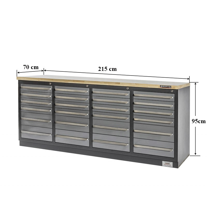 Ein Schmuckstück für jede Werkstatt ist diese massive Werkbank mit extra großen Schubladen und einer Holzarbeitsplatte. Dieses qualitativ hochwertige Werkbank basiert auf einem geschweißten Rahmen und wird komplett montiert geliefert. Die 24 Schubladen sind mit hochbelastbaren Kugellagerführungen ausgestattet, voll ausziehbar und mit 2,5 mm dicken Schaumstoffmatten versehen.