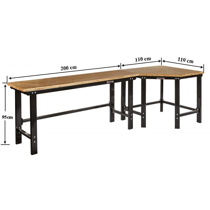 Übereck Werkbank mit 310 x 260 cm länge bestehend aus: 1 x Stabiler Werkbank mit den Maßen 200 x 61 x 95 cm 1 x Stabiler Werkbank mit den Maßen 150 x 61 x 95 cm und einer Fünfeck Verbindung mit den Maßen: 110 x 110 x 95 cm Die Werkbänke sowie die Fünfeck Verbindung besitzen eine 3,5 cm dicke Fingergelenk verklebte Hartholzplatte die auch extremsten...