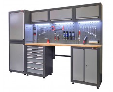 Die Elite-Line Werkstatteinrichtung hat eine elegante, aber robuste Ausstrahlung und passt farblich in viele Räumlichkeiten. Dieses solide Set mit serienmäßiger LED-Beleuchtung unter den 3 Hängeschränken, 220 V Steckdose, 2 USB-Anschlüssen und Luftschlauchanschluss eignet sich sowohl für den professionellen als auch für den Hobbygebrauch.