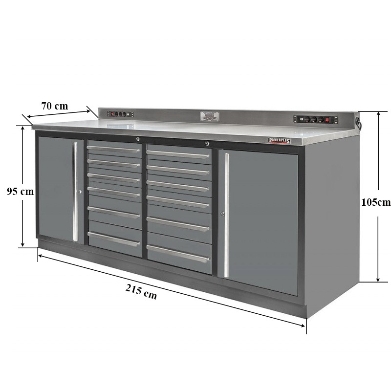 Ein Schmuckstück für jede Werkstatt ist diese robuste heavy duty Werkbank mit extra großen Schubladen und zwei geräumigen Schränken zur Aufbewahrung verschiedener Werkzeuge mit luxuriöser Edelstahl Arbeitsplatte. Dieses qualitativ hochwertige Produkt basiert auf einem geschweißten Rahmen und wird komplett montiert geliefert.