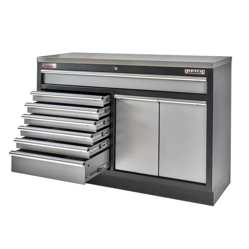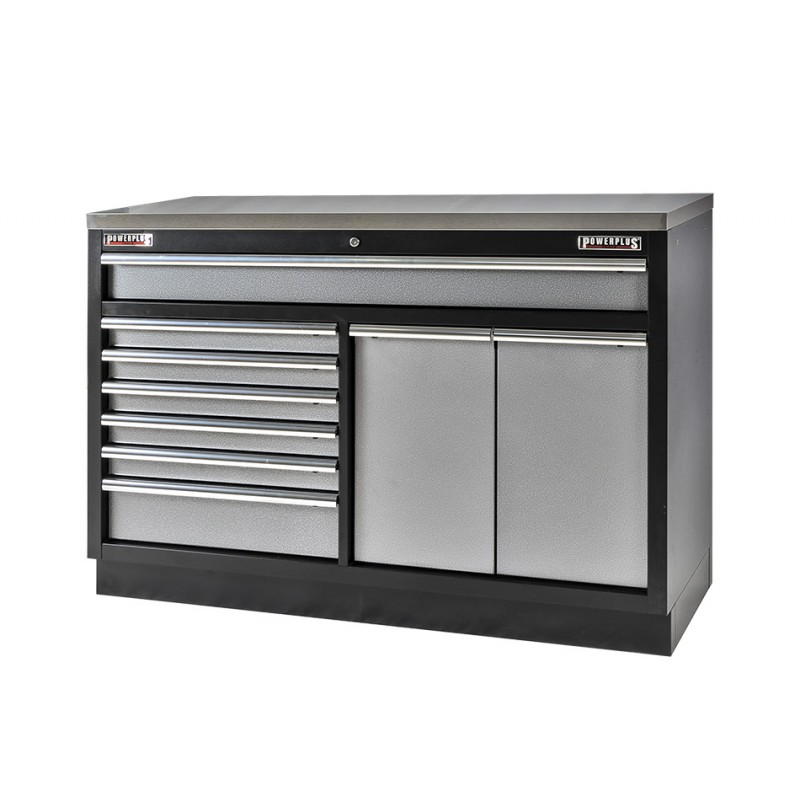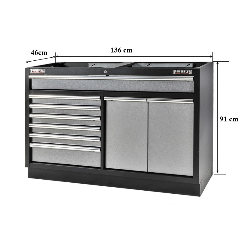 Stahluntergestell mit sechs höhenverstellbaren Füßen für zwei Premium Line Schränke. Passend für Powerplustools Artikel Nr.: 0884-0885-0886-1156-1173-1174-1766. Abmessungen: 136,5 x 44 x 11,5 bis 15,5 cm. (in der Höhe verstellbar). Gewicht: 7 kg. Ihre Schränke werden bei Verwendung dieses Rahmens mindestens 11,5 cm höher.