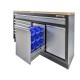 Werkstattschrank mit 7 breiten Schubladen + 1 hohe Schublade mit Kunststoff-Mülleimer und 1 Schublade mit 18 Kunststofflagerkästen.