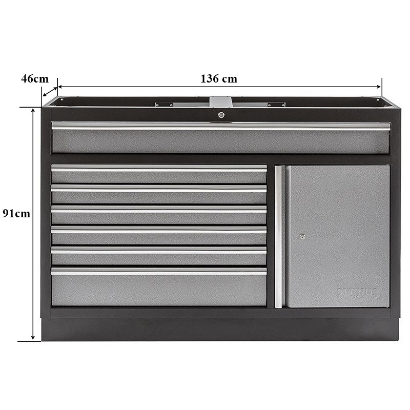 Stahluntergestell mit sechs höhenverstellbaren Füßen für zwei Premium Line Schränke. Passend für Powerplustools Artikel Nr.: 0884-0885-0886-1156-1173-1174-1766. Abmessungen: 136,5 x 44 x 11,5 bis 15,5 cm. (in der Höhe verstellbar). Gewicht: 7 kg. Ihre Schränke werden bei Verwendung dieses Rahmens mindestens 11,5 cm höher.