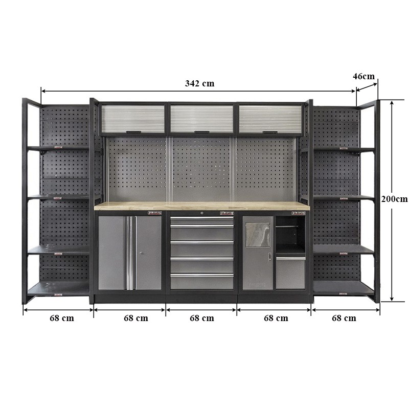 Komplettes Werkbank Set 342 cm mit Hartholzplatte bestehend aus: