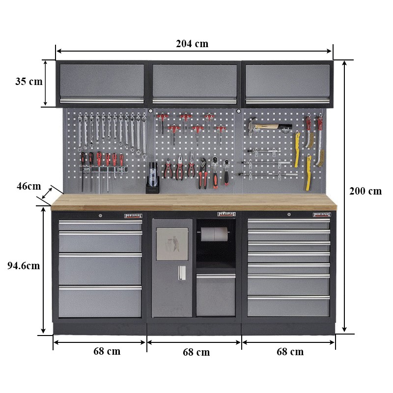 Maße Werkzeugschrank: 68 x 46 x 91 cm (B x T x H, Außenmaße ohne Arbeitsplatte)