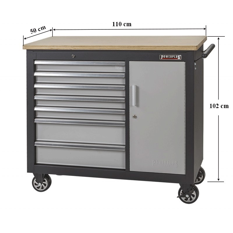 Dieser Robuste Werkstattwagen mit einer 30 mm starken Multiplex Arbeitsplatte besitzt 7 kugelgelagerte Schubladen und einen großen praktischen Werkzeugschrank für die Aufbewahrung jeglicher Art von Werkzeug