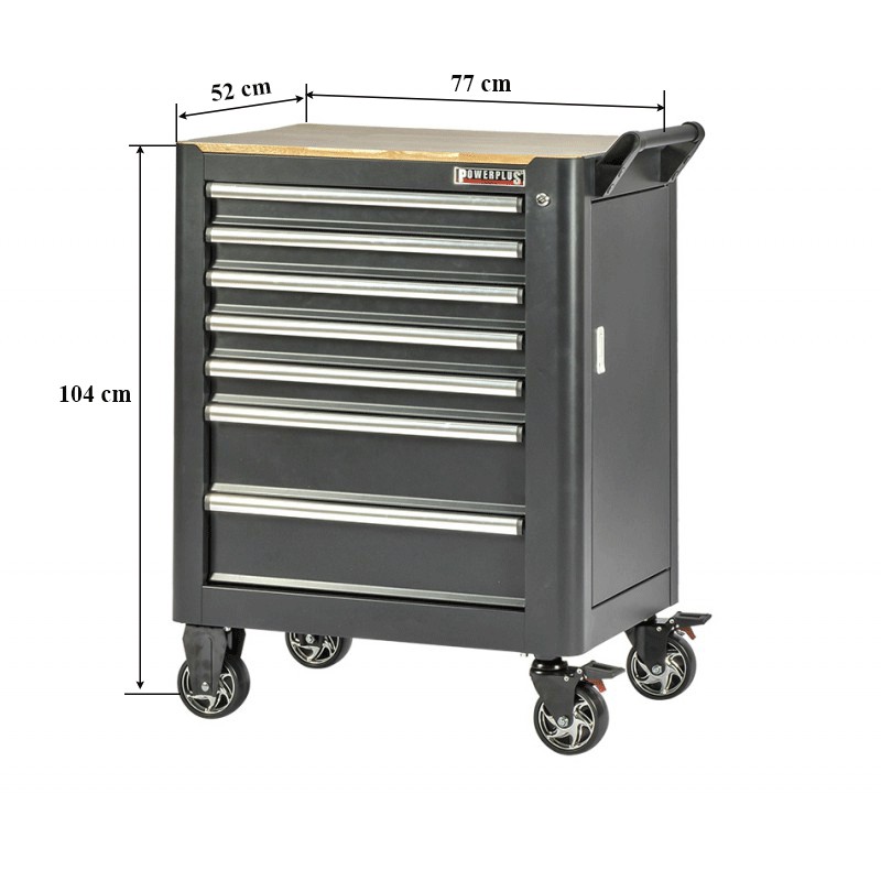Mit Abmessungen von 77 x 52 x 104 cm (Breite x Tiefe x Höhe) und einer Gesamtbreite von 85 cm inklusive Griffstange/Lenkgriff bietet dieser Werkzeugwagen ausreichend Platz für Ihre Werkzeuge.