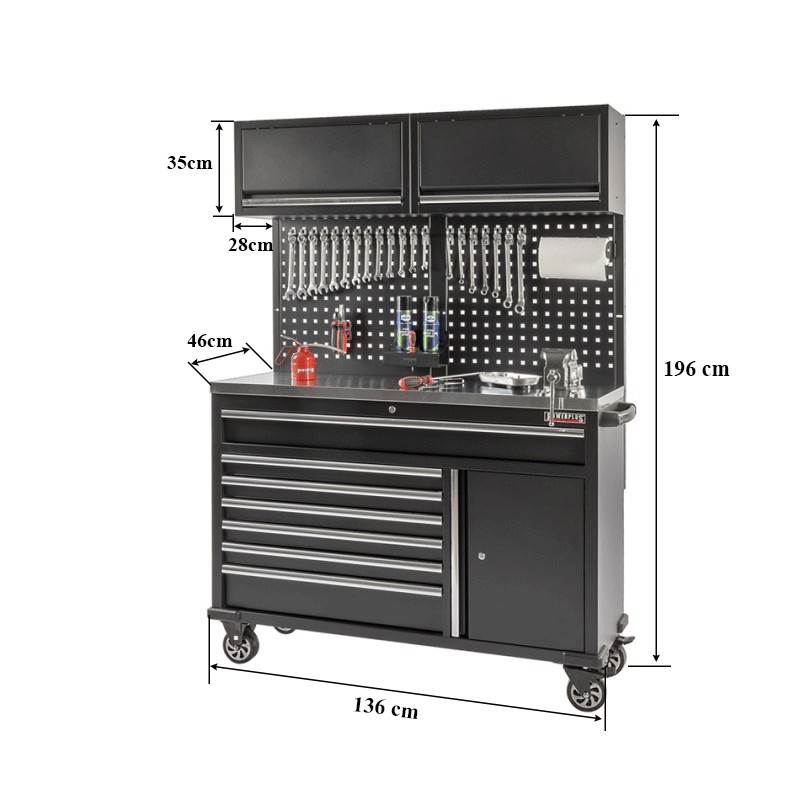 Die Abmessungen von 136 (143 cm einschl. Griffstange) x 46 x 196 cm (L x B x H) machen sie zu einem großzügigen Arbeitsbereich der zusätzlichen Komfort bietet.