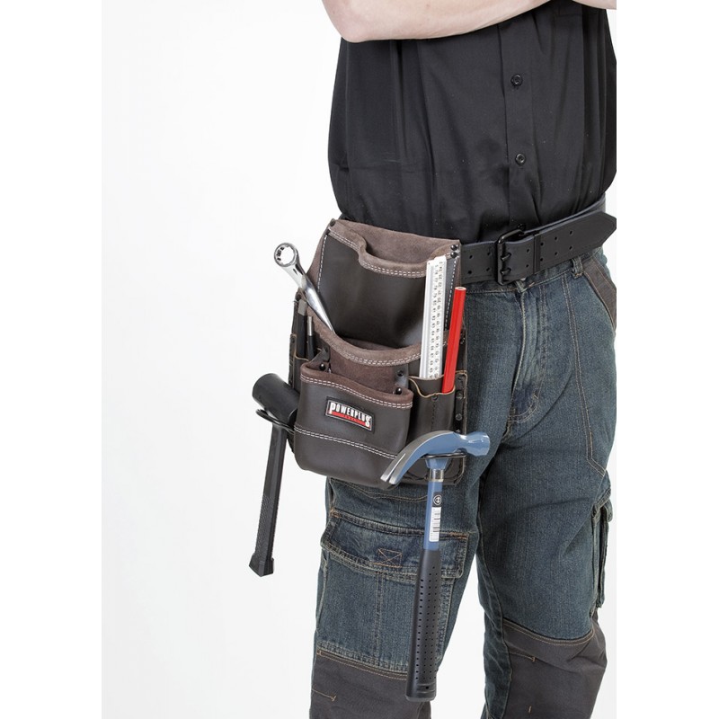 Die praktische Werkzeug Ledertasche besitzt 1 große sowie 2 kleine Außentasche und ist leicht am Gürtel zu befestigen.